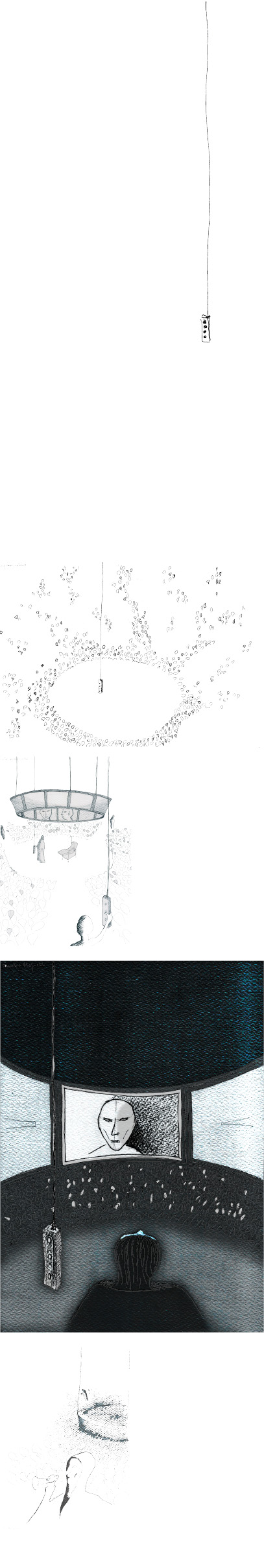Este elemento tendrá tres posiciones además de la de reposo en el peine: sobre el suelo, media altura y a tres metros, de manera que la CORONA con su movimiento y posición hará la transición entre escenas.