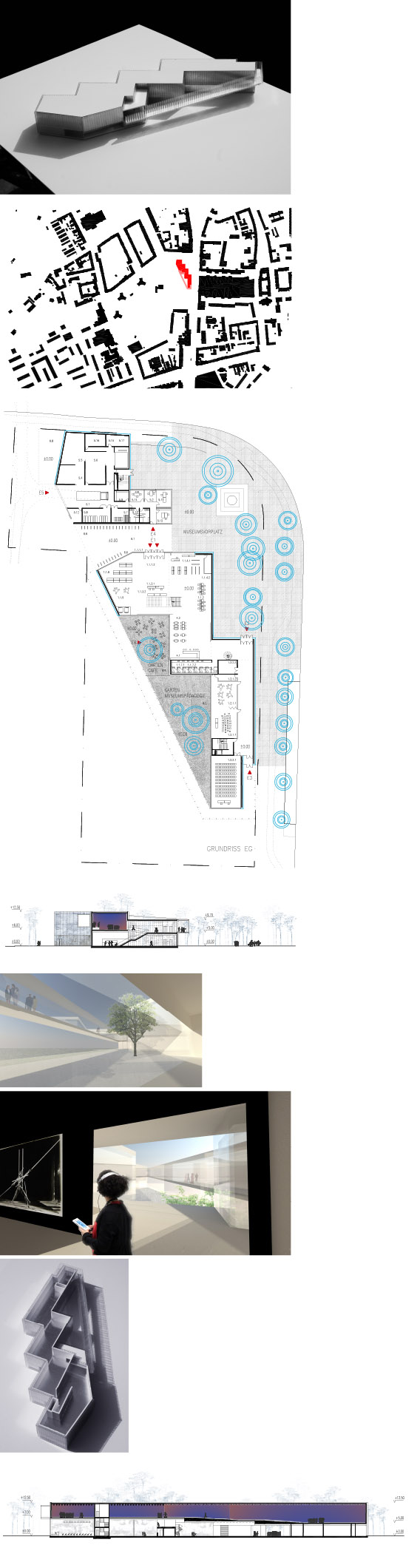Dieses rundgangartiges Museum “mündet” durch eine leichte, durch Vegetation teilweise versehene Pasarelle erneut im Foyer. Dabei werden die Aussenräume des Museums in unmittelbarer Beziehung zum Stadtpark baulich erfasst und definiert.